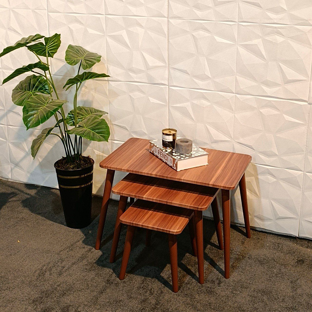 میز عسلی مینیمال سه تکه مدل 325 شامل سه عدد میز کنار مبل در سه سایز مختلف میباشد که کاملا در زیر یکدیگر کاور و پنهان میشوند و در حین کاربردی بودن فضای کمی را اشغال میکنند – ابعاد عسلی بزرگ 65 * 40 در ارتفاع 45 و میز عسلی متوسط 45 * 33 در ارتفاع 37 و میز عسلی کوچک 35 * 28 در ارتفاع 30 میباشد و این ست به زیباترین حالت فضای منزل را دیزاین میکند
